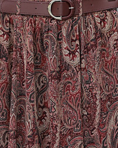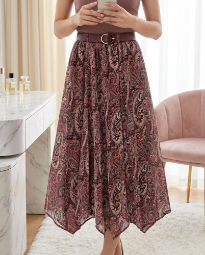 • Asimetrik Kesim Astarlı Kemerli Şifon Etek Bordo